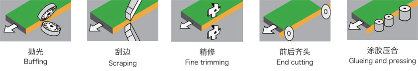工作原理:涂膠、齊頭、精修、刮邊、拋光。