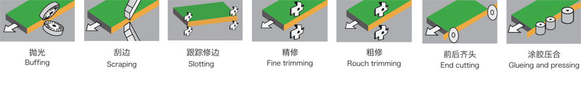 工作原理:涂膠、齊頭、粗修、精修、仿型跟蹤、刮邊、拋光。